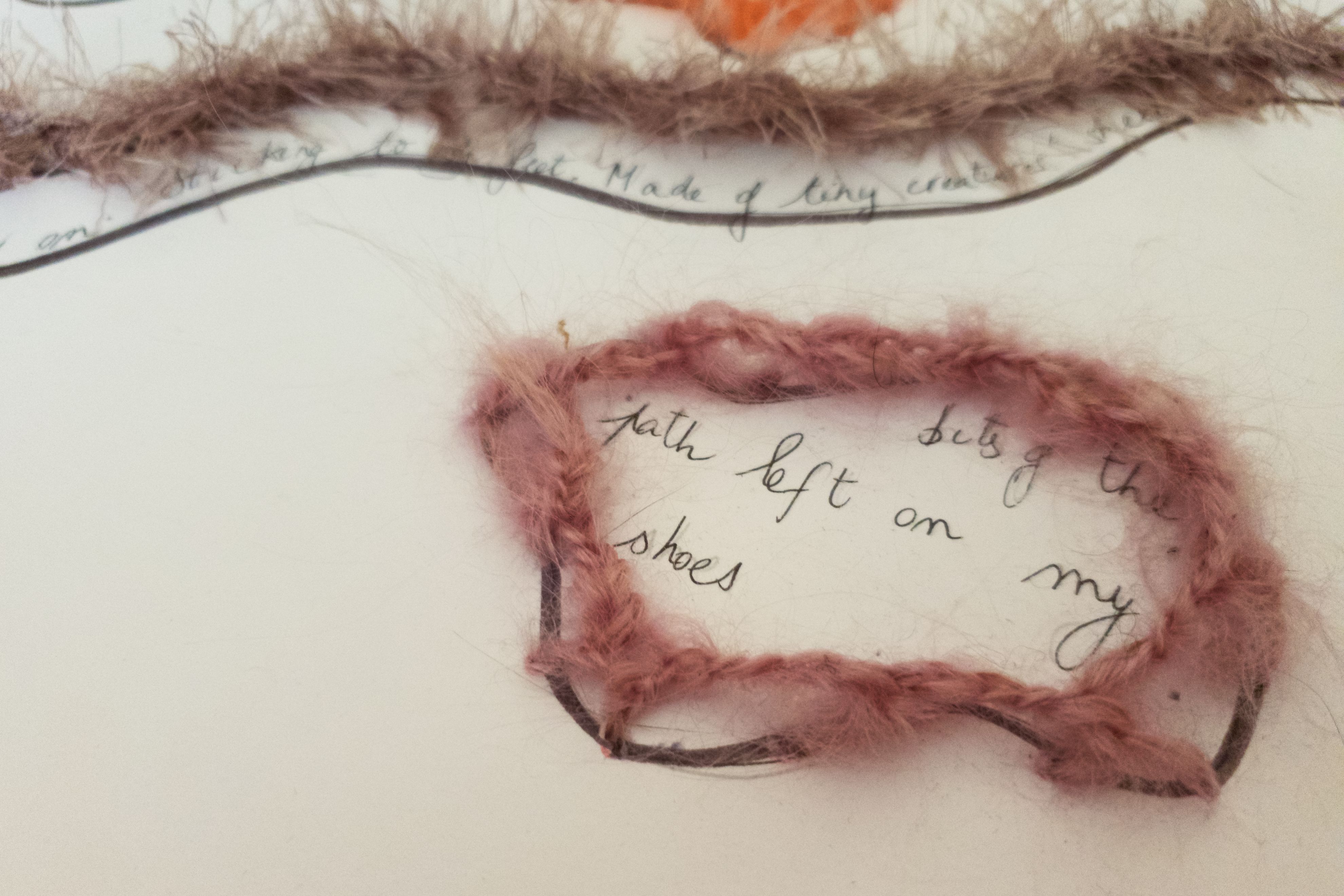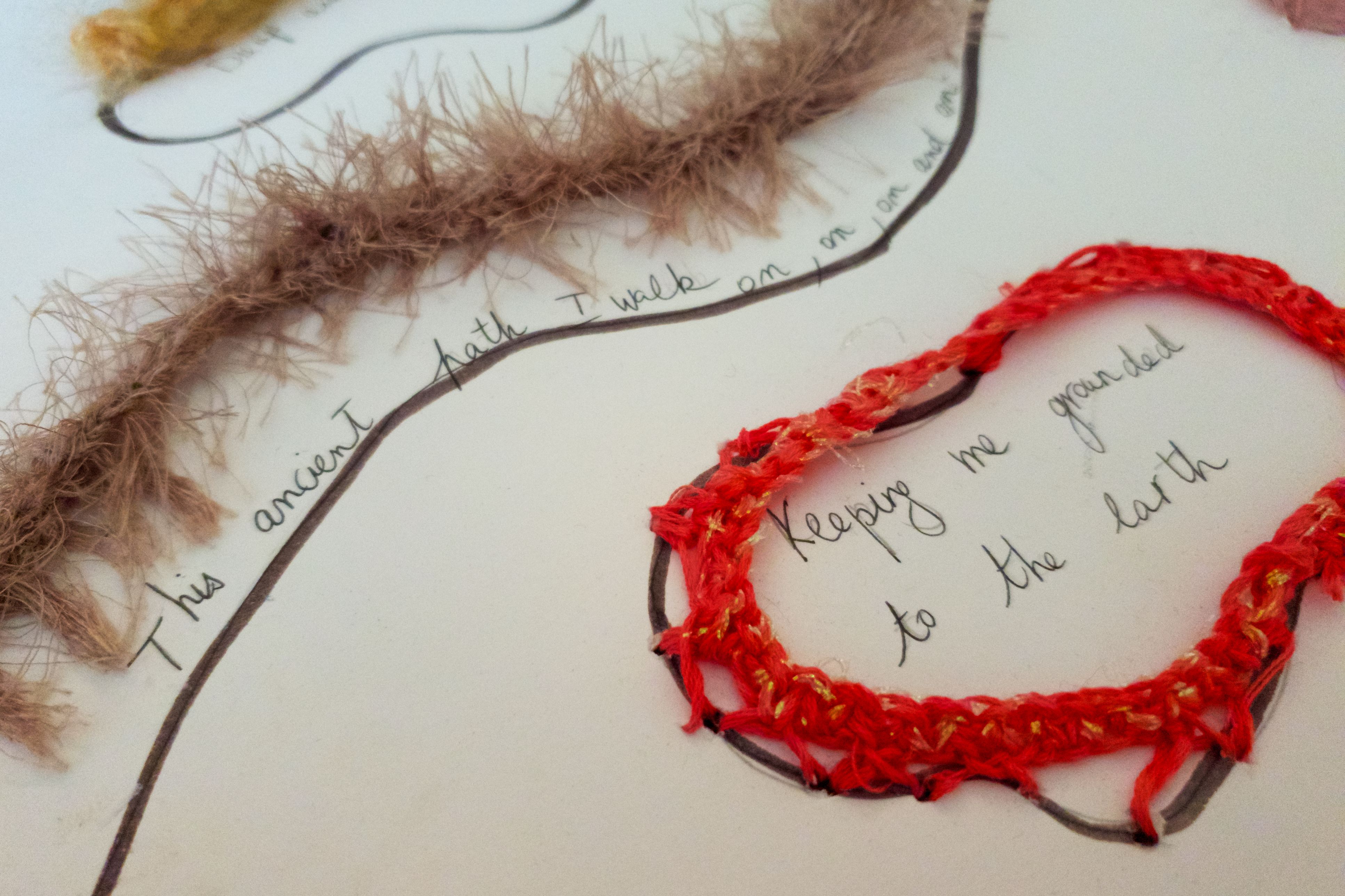 Materials: felt tip, yarn crocheted through paper