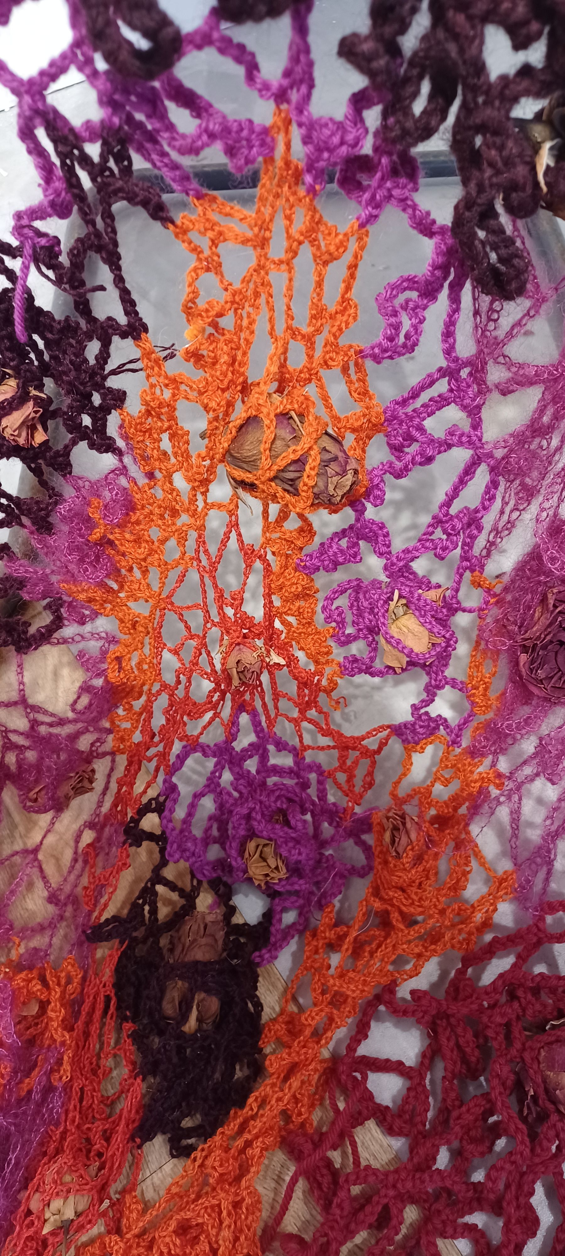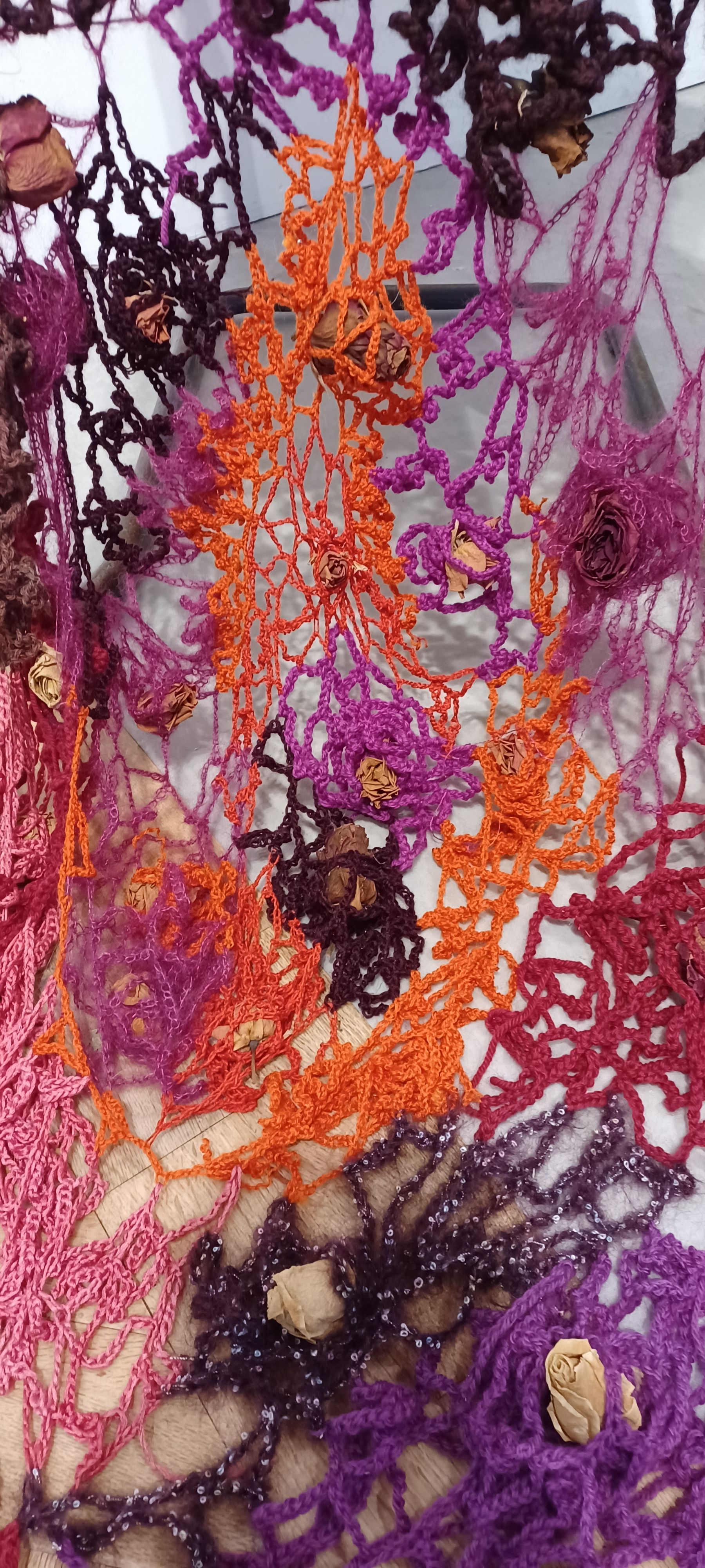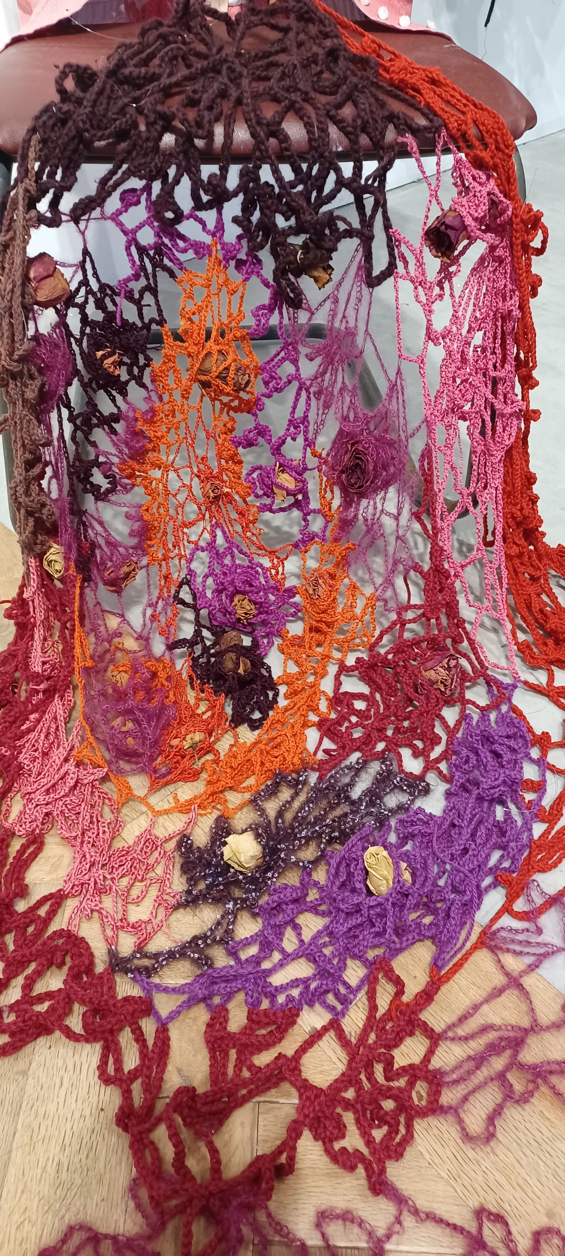 Chair, clothing, yarn, dried flowers, crochet hook
